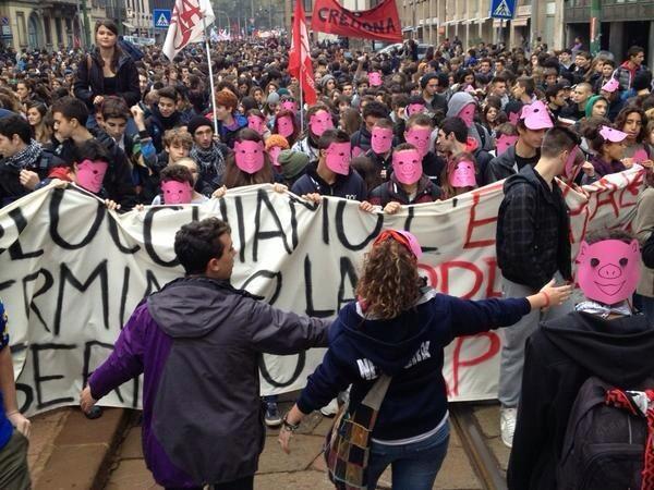 Στο Τορίνο, χιλιάδες διαδηλωτές με ένα «άρμα» που παρίστανε ένα δράκο-αναπαράσταση του παγκόσμιου κεφαλαίου με ένα πλακάτ στα σαγόνια του που έγραφε «δουλειά» ΕΞω από την εφορία της πόλης, η αστυνομία έριξε δακρυγόνα στους διαδηλωτές όταν επιχείρησαν να μπουν. (συνεχίζεται)