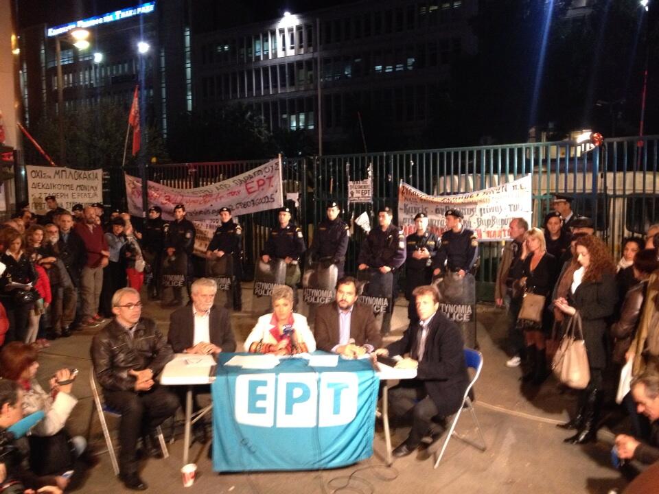Οι τρεις Ομοσπονδίες καλούν απόψε στις 6 το απόγευμα τους Προέδρους των σωματείων στα Προπύλαια του Πανεπιστημίου και όλους τους άλλους εργαζόμενους και αλληλέγγυους πολίτες έξω από το υπό αστυνομική κατάληψη ραδιομέγαρο της ΕΡΤ στην Αγία Παρασκευή.